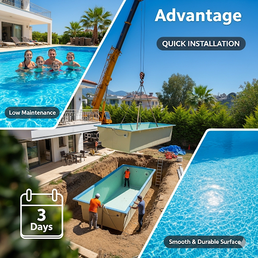 Hızlı ve Kolay Kurulum: Belki de en büyük avantajı budur. Aylar süren inşaat süreçlerinin aksine, fiberglass havuzlar genellikle birkaç hafta içinde kurulur ve kullanıma hazır hale gelir.